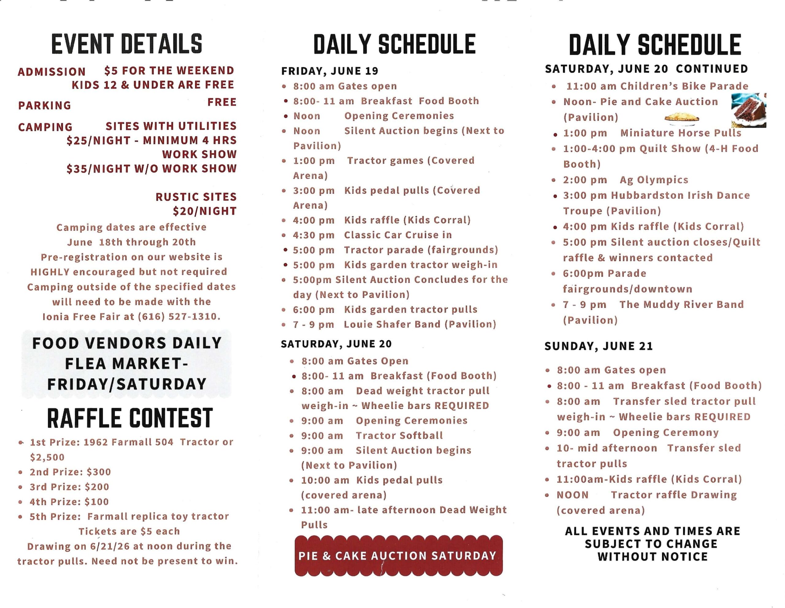 Yes there’s free music, and dozens of other activities that everyone can watch throughout the weekend. But there are many that kids, adults, and families can join in, too! Pie and Cake Auction AND a silent Auction Friday and Saturday, tractor baseball, pedal tractor pulls, AG Olympics, and lots more.